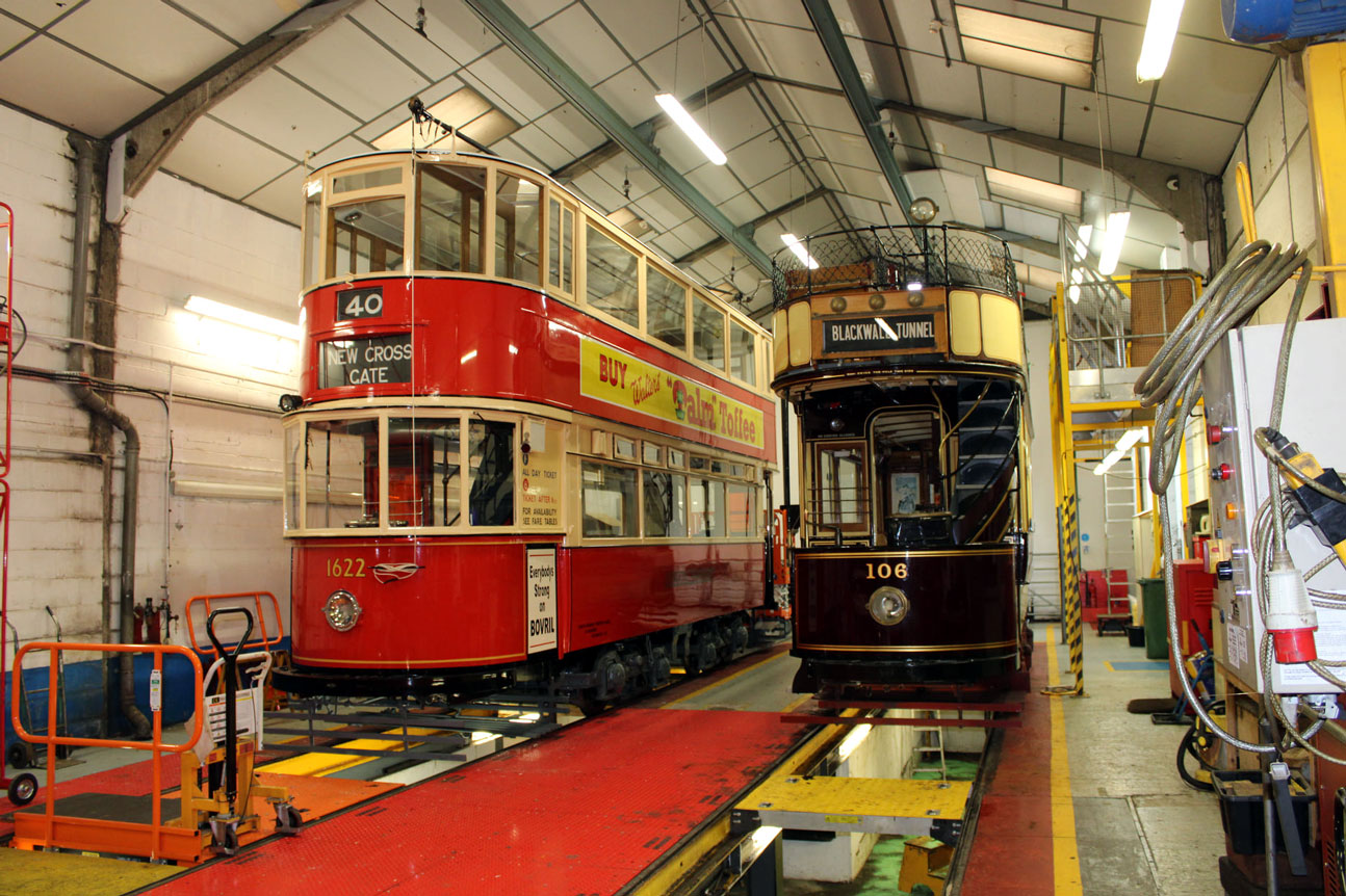 At the front of the workshop London County Council 106 is undergoing routine maintenance alongside London Transport 1622. The latter is now at the end of an extensive overhaul and repaint with period advertisements now applied (which are different on each side!), and should be back in service soon following a period of test running.