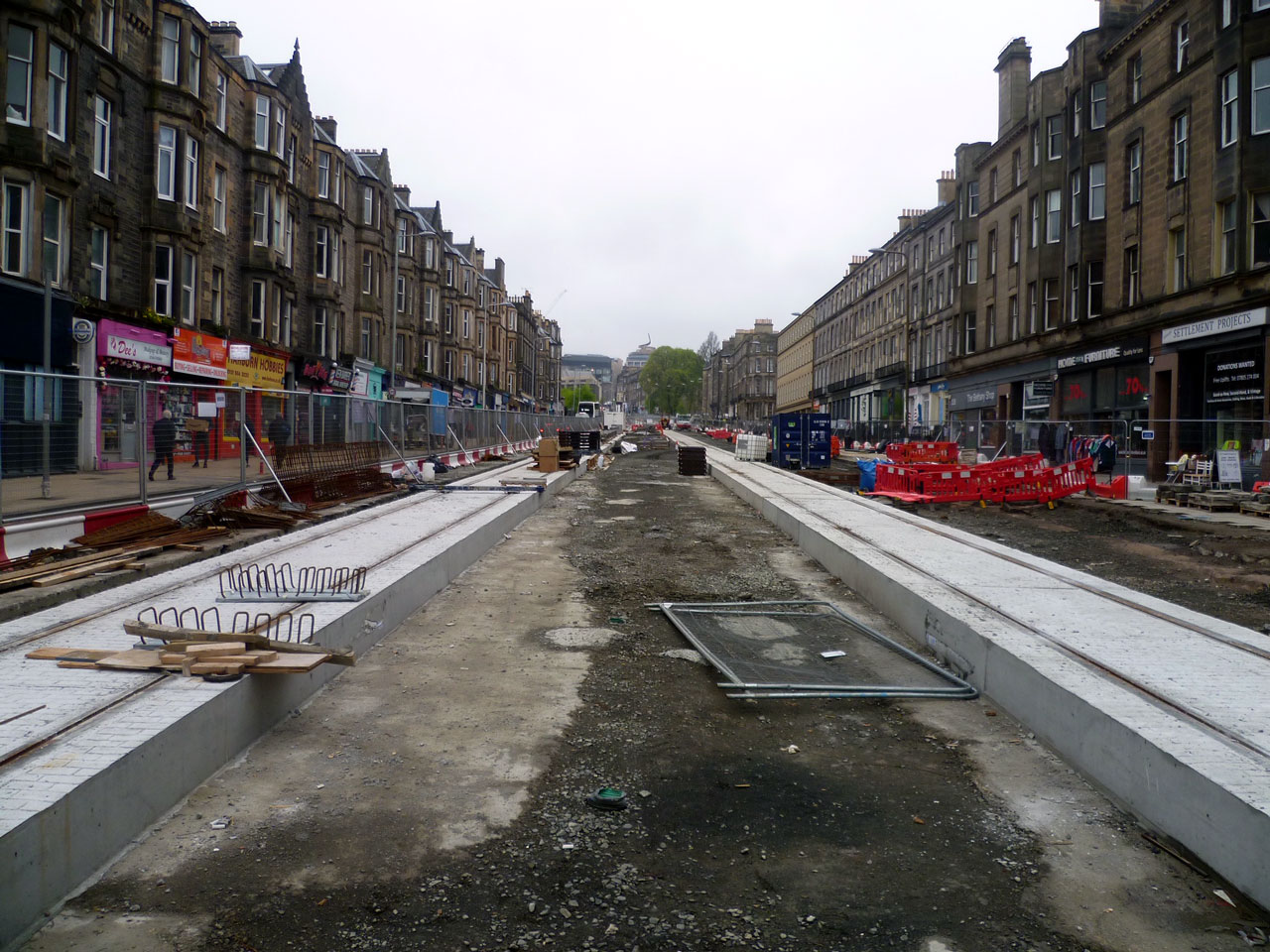 In this image we are looking southwest towards the city centre with Elm Row on the left and Haddington Place on the right. The Airport bound track is that on the left with the Newhaven track on the right hand side of this shot. In the centre background you can make out St James Quarter which will see its first new shops opening on 24th June of this year. On the left hand side the shop with the red and yellow frontage is the popular and long-standing transport model shop, Harburn Hobbies with the converted office block centre right on Haddington Place being Hostelling Scotland’s Edinburgh Central Youth Hostel. (Photograph by Roy Calderwood, 13th May 2021)