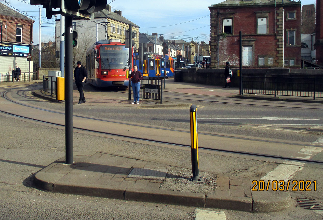121 is just curving round onto Holme Lane as it heads on the Blue route to Malin Bridge. (Photograph by Stuart Cooke, 20th March 2021)