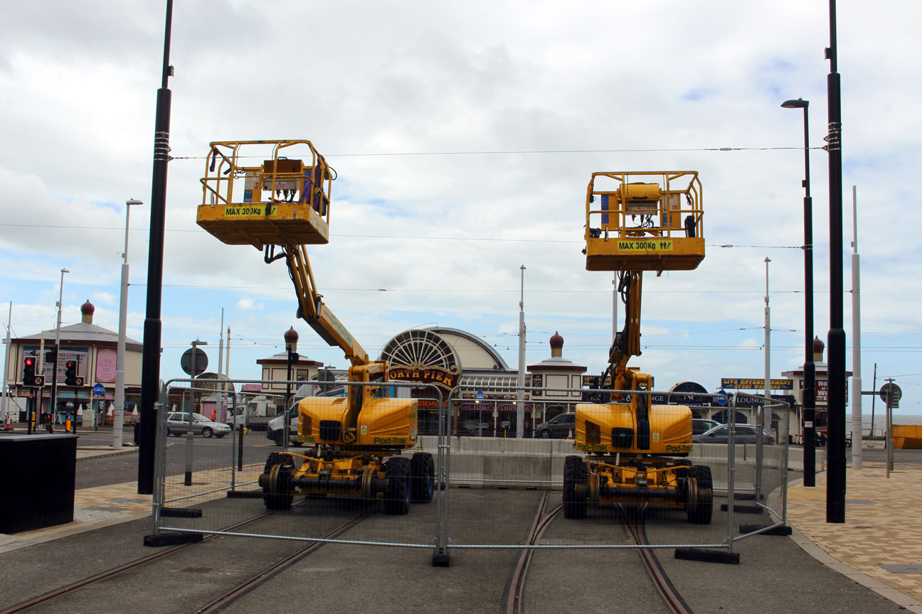 The Cherry Pickers in their compound at Talbot Square on 25th May with the new span wire now seen installed above them.
