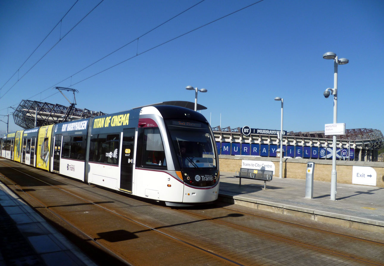 In this image we see 257 arriving at Murrayfield Stadium bound for the city. The tram advertises the Ray Harryhausen – Titan of Cinema Exhibition at the Scottish National Museum of Modern Art which will reopen on 26th April and has now been extended until February 2022. (Photograph by Roy Calderwood, 14th April 2021)