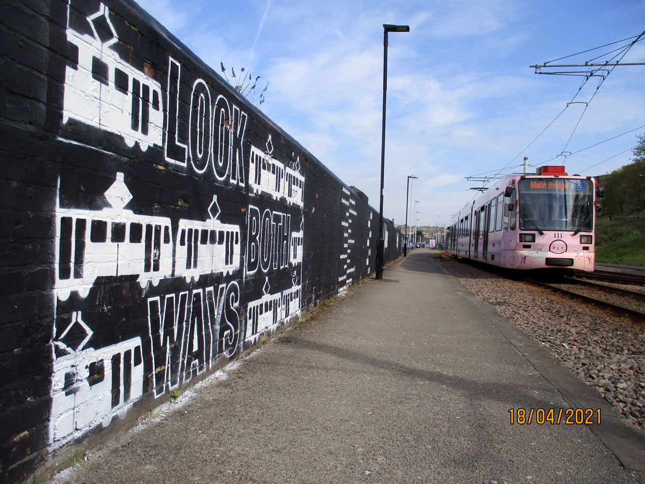 In this image we see 111 leaving Sheffield Station for Malin Bridge on a Blue route service. The Granville Street Gallery is on the left with the “Look Both Ways” piece of art.