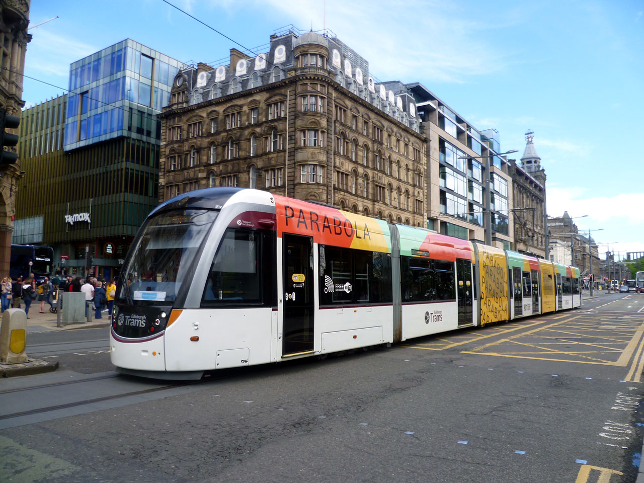 In this photo we see 274 between the stops at St Andrew Square and Princes Street as it works a service bound for the Airport. Old Waverley Hotel (originally a temperance hotel) is seen on the corner of Princes Street and South Saint David Street which is an 1880s rebuild of an earlier building. The dark blue Airport bus is just visible at its current terminus in front of the modern building with TK Maxx on the ground floor. (Photograph by Roy Calderwood, 22nd May 2021)