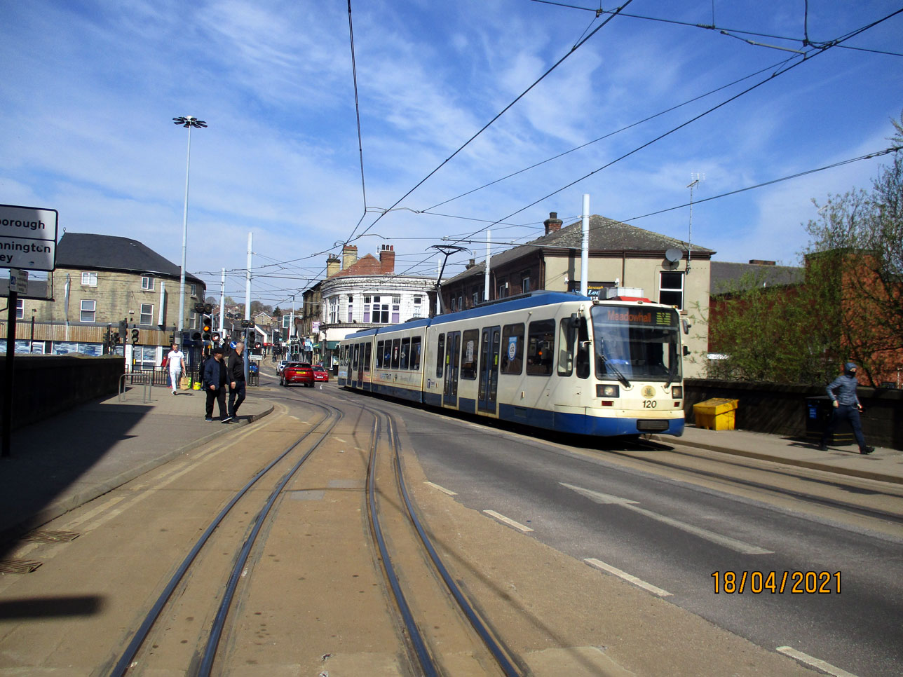 We see 120 here just arriving at Hillsborough when working on the Yellow route from Middlewood to Meadowhall. (Photograph by Stuart Cooke, 18th April 2021)