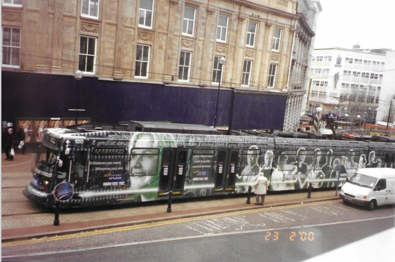 120’s Ask JON advert is seen on the tram as it works through the city centre. (Photograph by Stuart Cooke)