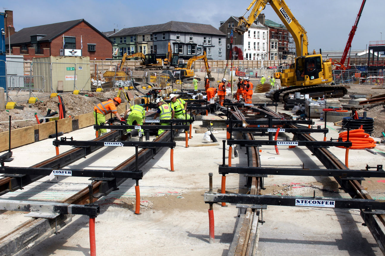 Ta-da! Track going down at Wilko’s with the Steconfer track gauges in place to check everything is in order. Notice that as well as the plain track in the foreground that around where the group of workmen in orange are is a scissors crossover being installed.