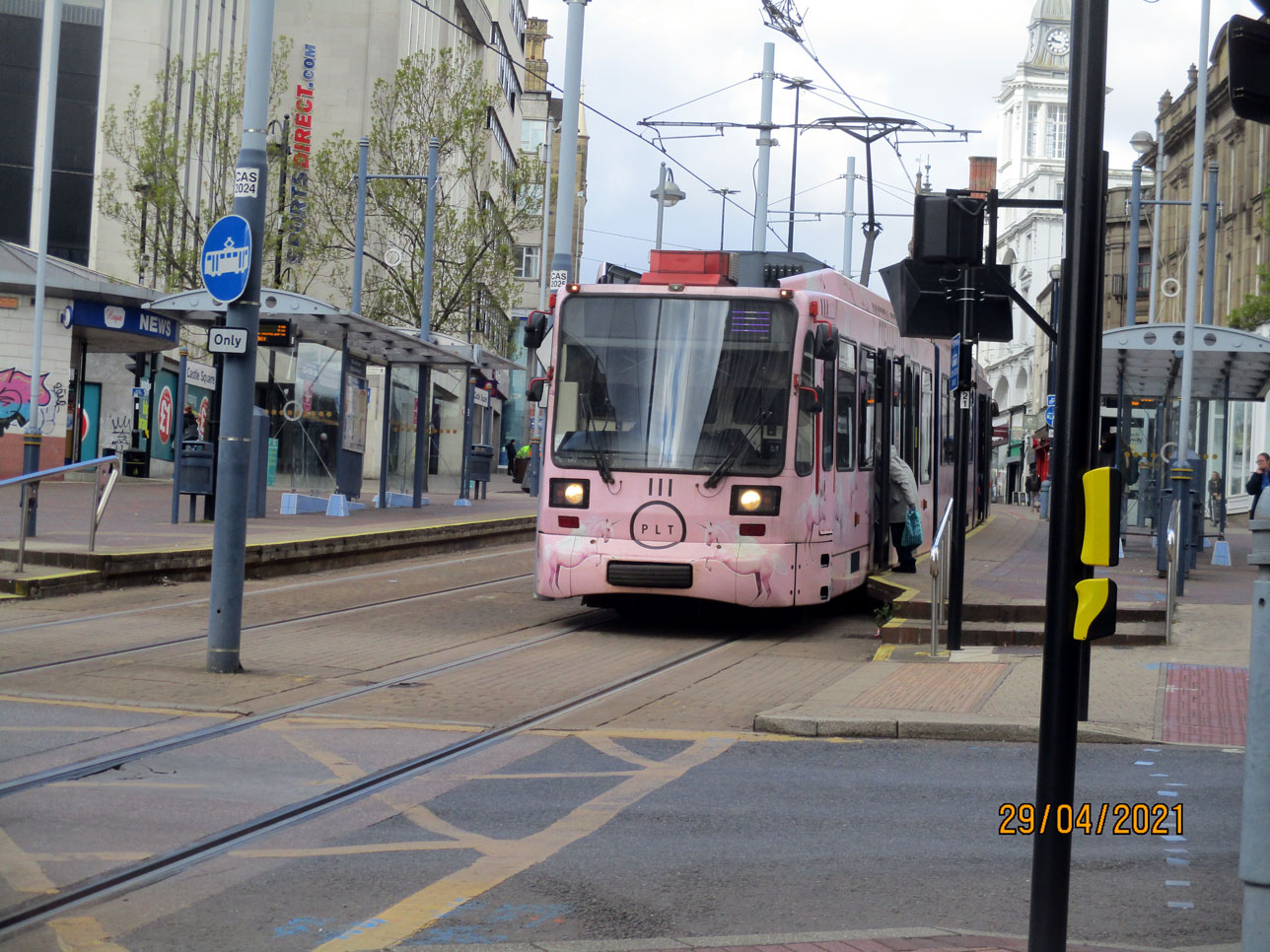 In this picture we see 111 at Castle Square with a solitary passenger boarding the tram. It is running on the Purple route when seen in this photo and is on the way to Herdings Park. (Photograph by Stuart Cooke, 29th April 2021)