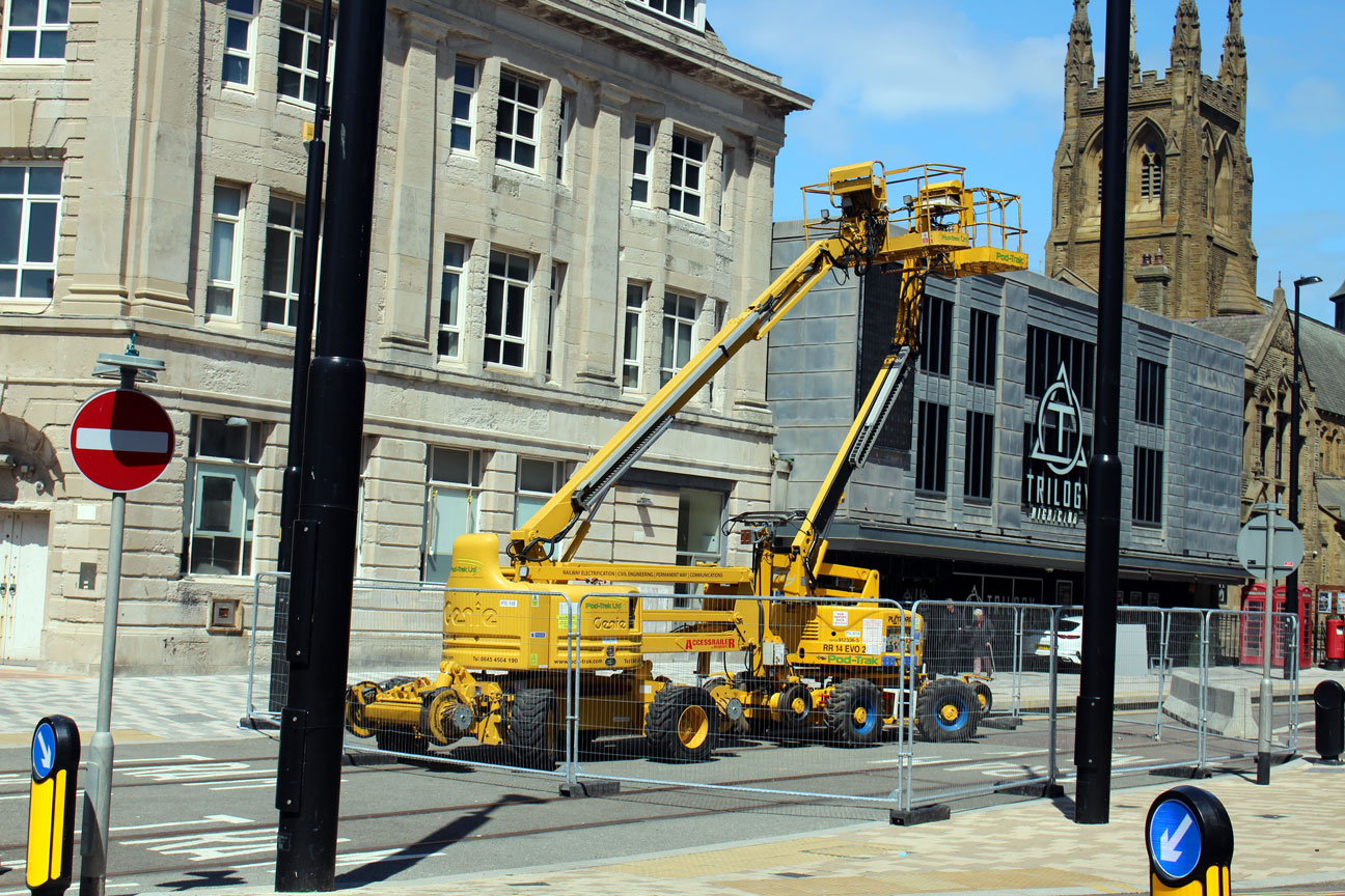 The Pod-Trak cherry pickers are back in Talbot Square! They are currently sat on the station bound track. (Photograph by Tony Armitage, 5th July 2021)