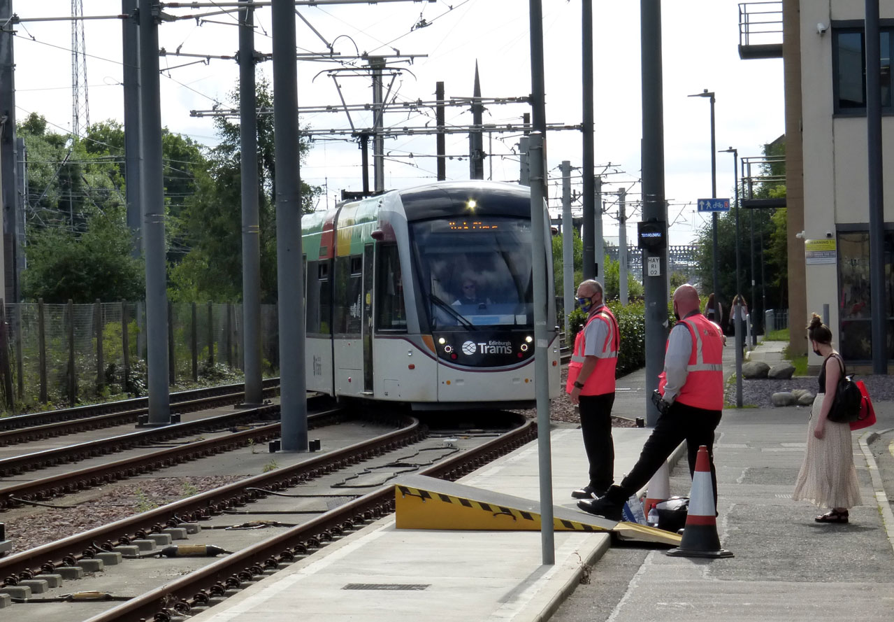 Tram 274 approaches the temporary terminus and is entering the layby track at Haymarket Yards.