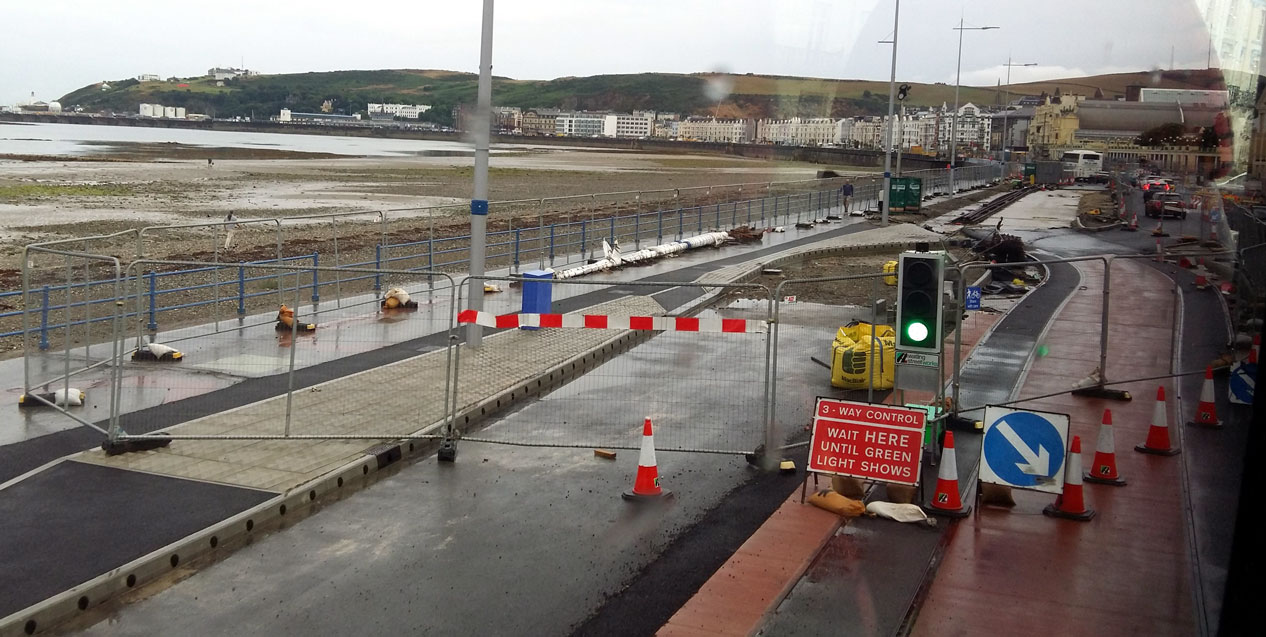 Taken from the top deck of a bus running along the Prom we are outside the Villa Marina here with the traffic controlled by temporary traffic lights. The red/pink tram corridor can be seen and we can also see some track in the distance.