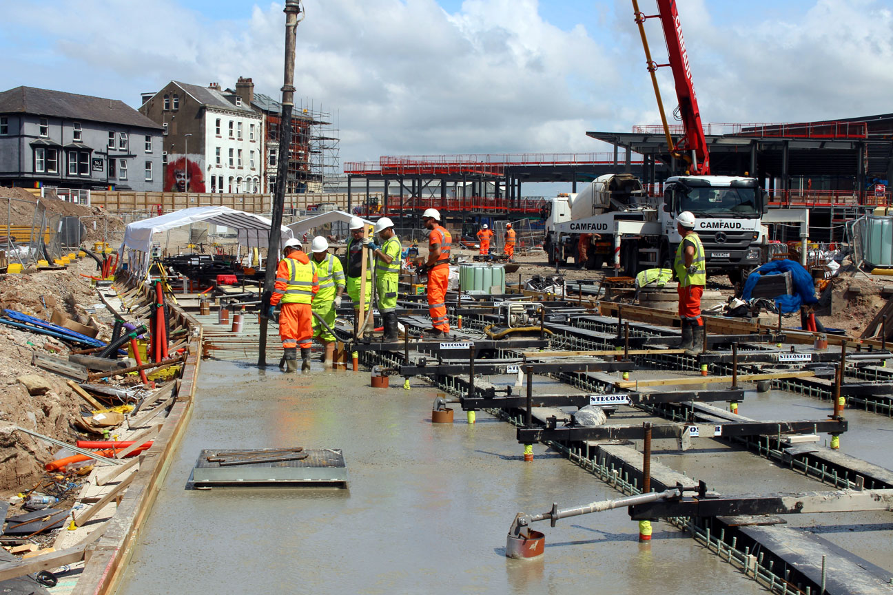 Up at Wilko’s and the concrete is seen still being poured here on the track just through the entrance to the worksite. Just beyond the hose pouring the concrete you can see the wire mesh which had been put down under the whole section of track already down but has now disappeared closer to the camera thanks to the concrete. (Photographs x4 by Tony Armitage, 3rd August 2021)