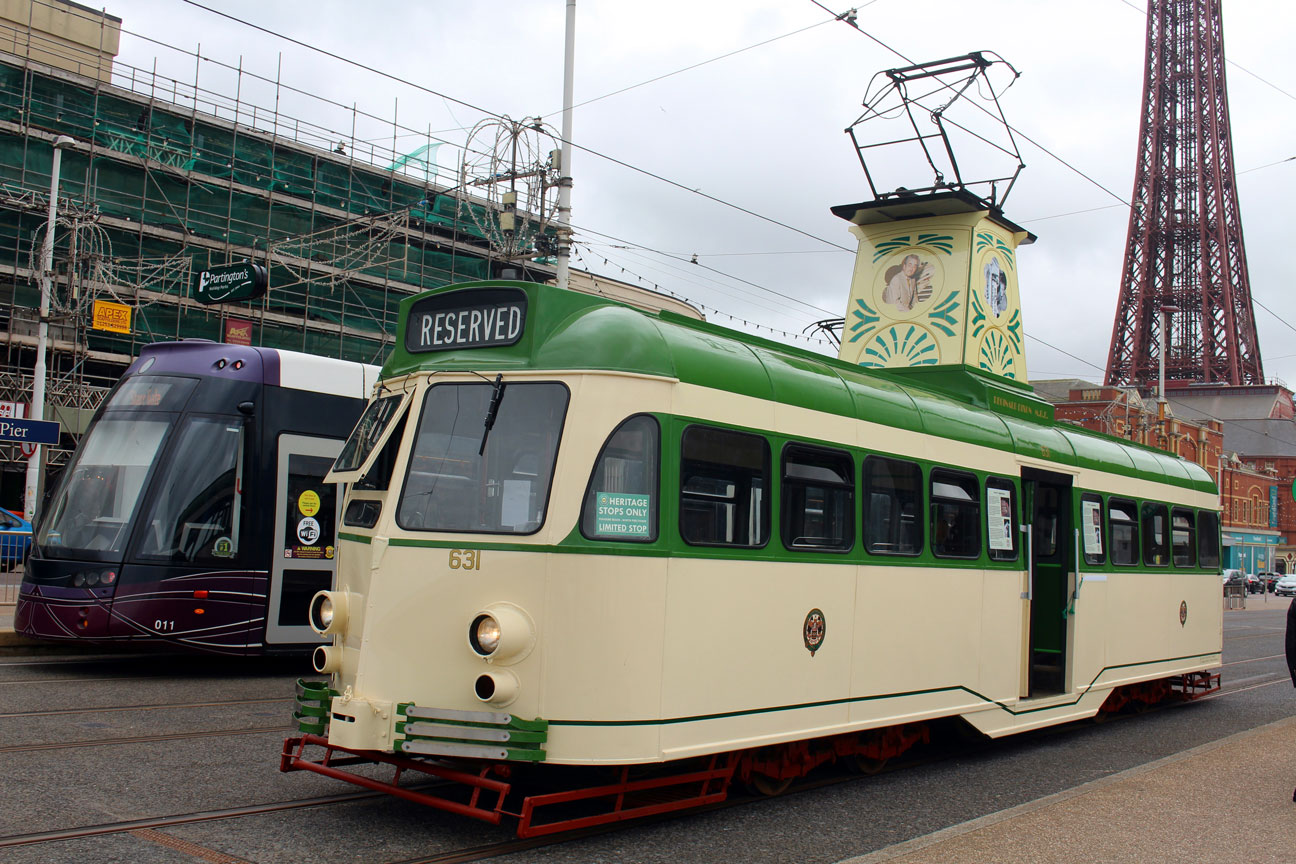 As 631 waits at North Pier heritage stop for departure on its launch – invited guests only – trip Flexity2 011 is seen alongside.