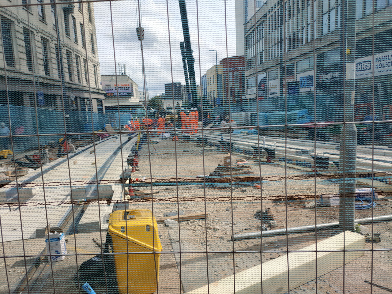 Looking away from the stop at Bull Street towards where the junction will be installed we see the first new tracks have been laid along with final surface. Work is still required including the completion of the surface between the two tracks.