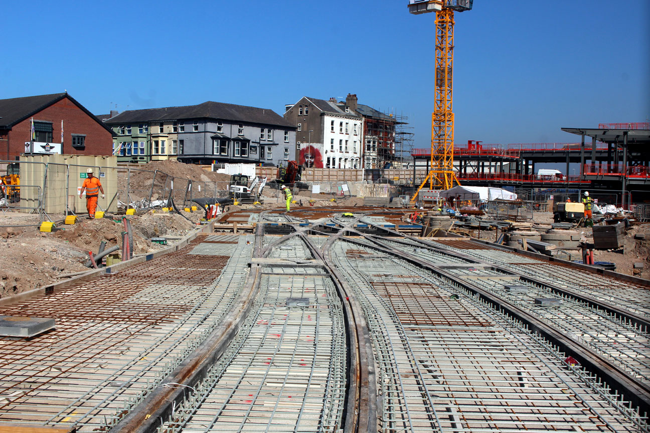 Looking along the tracks from the entrance this view shows the track up to the scissors crossover with concrete and the wire mesh in place in the foreground.