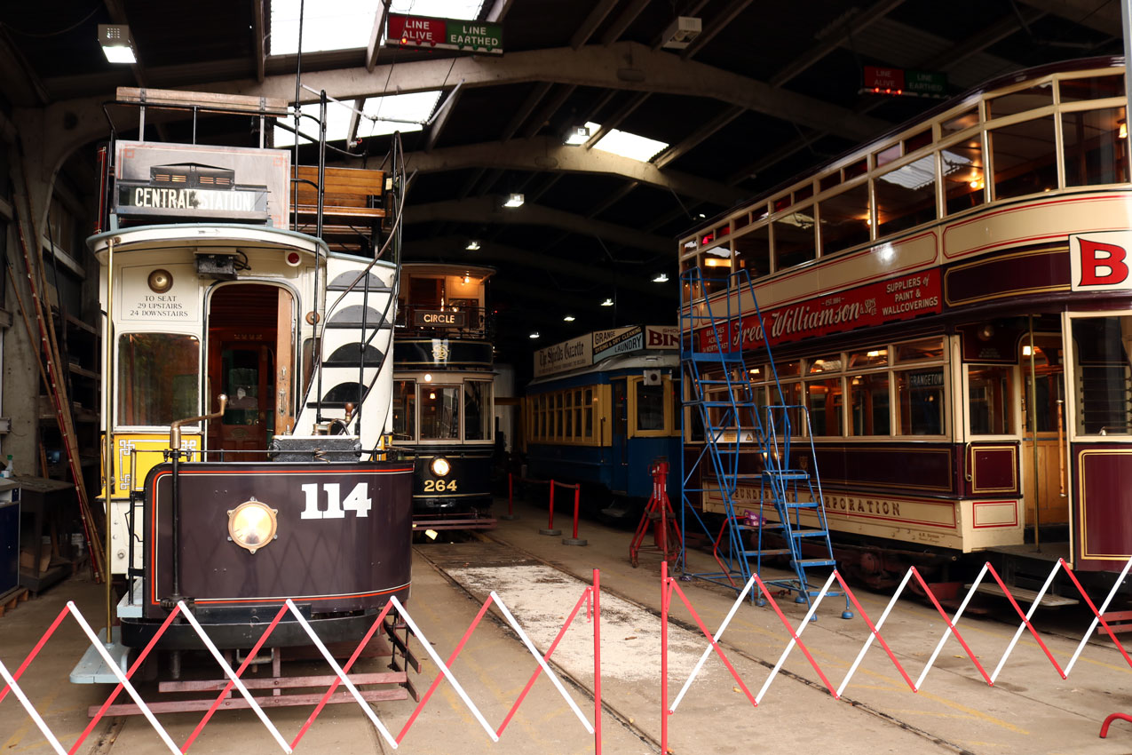 Inside the main tram shed with four operational trams seen in this shot: Newcastle 114, Sheffield 264, Sunderland 16 and Oporto 196.