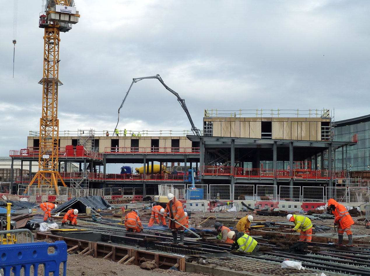 With 11 contractors involved there is work going on here around the tram tracks, seemingly preparing for some further work in the future. In the background we see the hotel/restaurant with concrete being poured using the chute which is being fed by the yellow cement lorry on High Street. (Photograph by Peter Dockerty, 20th October 2021)