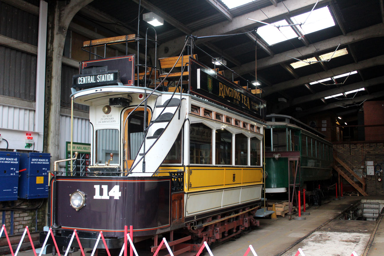 Inside the depot and Newcastle 114 waits at the front of road 2 with Grimsby & Immingham 26 (Gateshead 10) still lifted on wooden blocks as its overhaul continues.