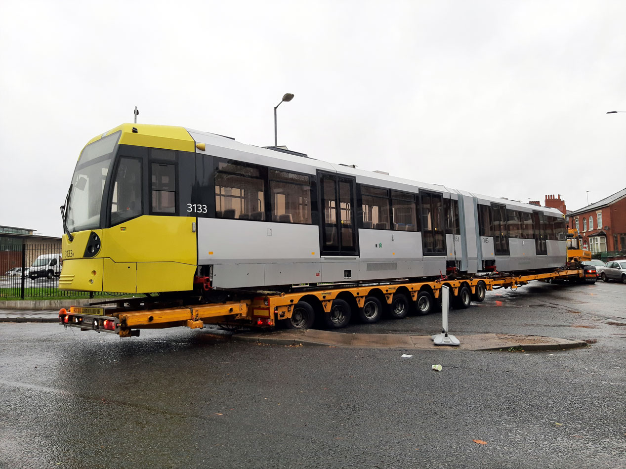 3133 arrives in Manchester for the first time on the back of the low loader. As with previous arrivals it is missing its spots which will be applied at Queens Road before it enters service. (Photograph by Ben Worsley)