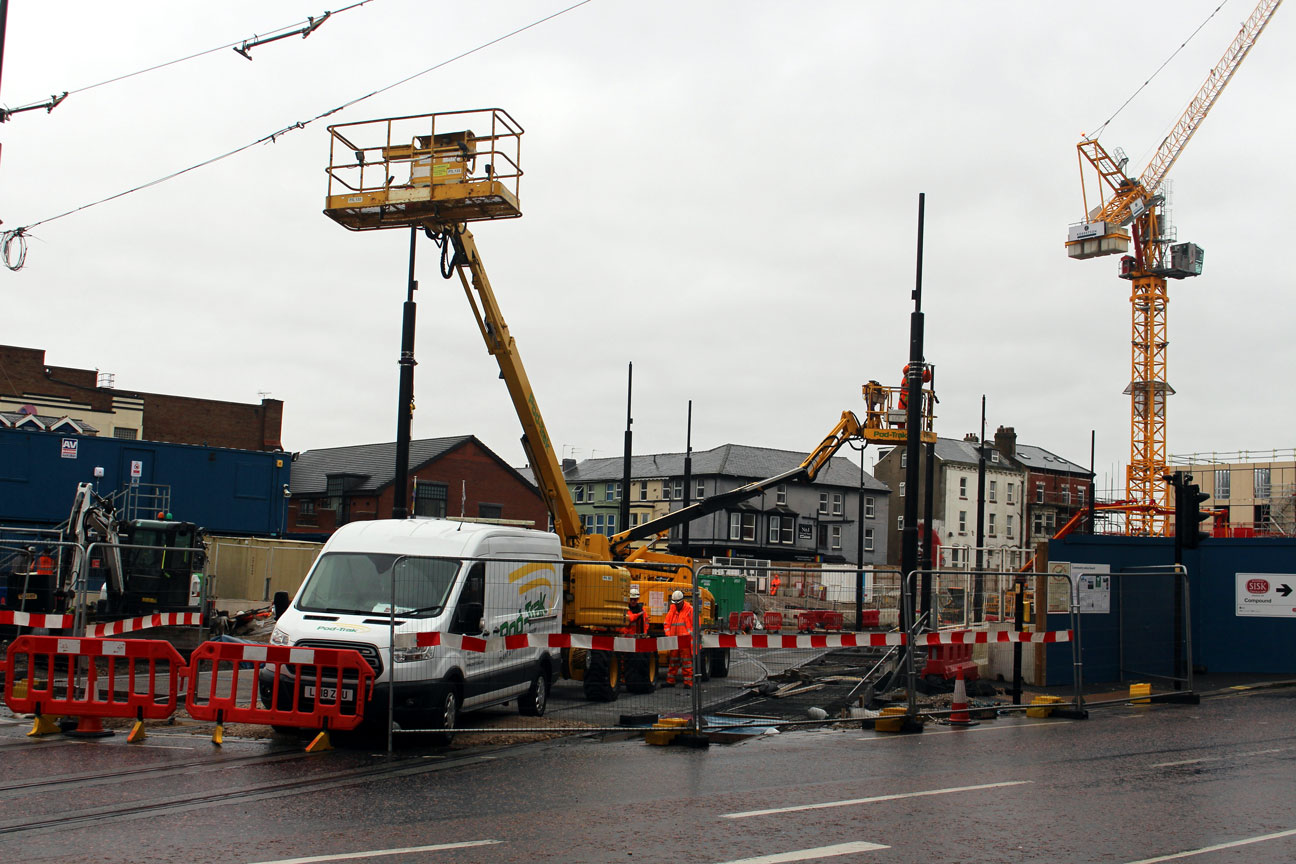 With the cherry pickers which have been in and out of Blackpool several times during this work back this view looks into the Wilko’s site where the first overhead poles are being put up.