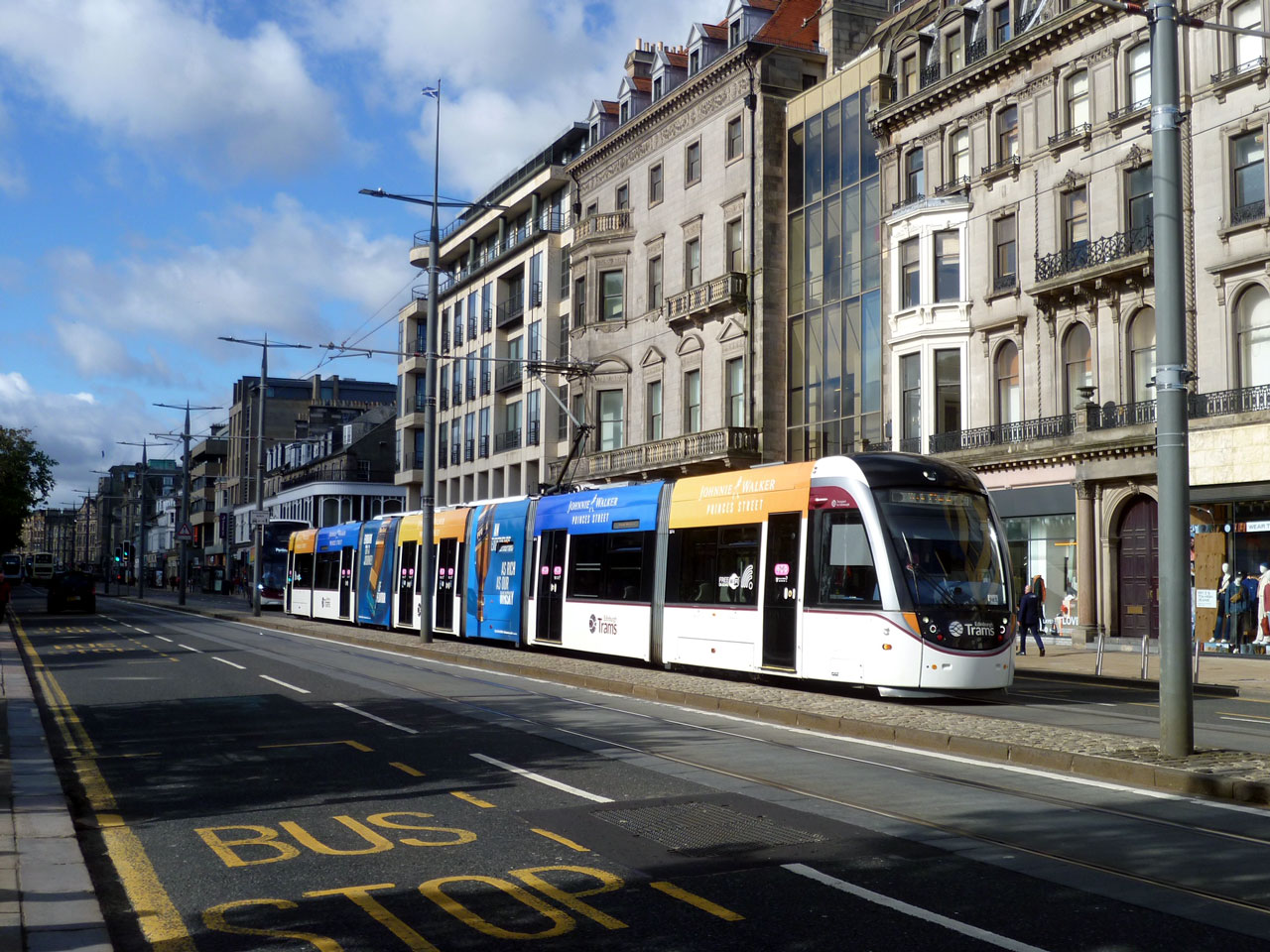 Another shot of 267, showing the graphics of the advert as it heads east on Princes Street to York Place. The tram is passing the now closed Debenhams store due to be reconfigured as a Marriott Tribute Hotel plus some retail element. (Both Photographs by Roy Calderwood, 29th September 2021)