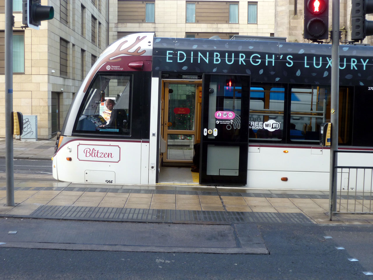 The Blitzen name and antlers on one end of 270 are seen here as the tram stands at York Place.