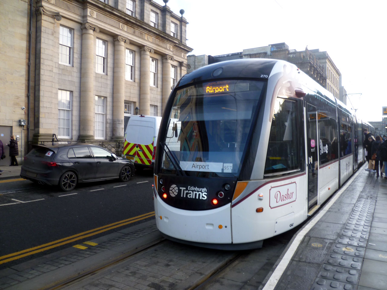 The Dasher name is carried on the other end and side of 270. This is the tram at St Andrew Square as it heads to the Airport. (All Photographs by Roy Calderwood, 10th December 2021)