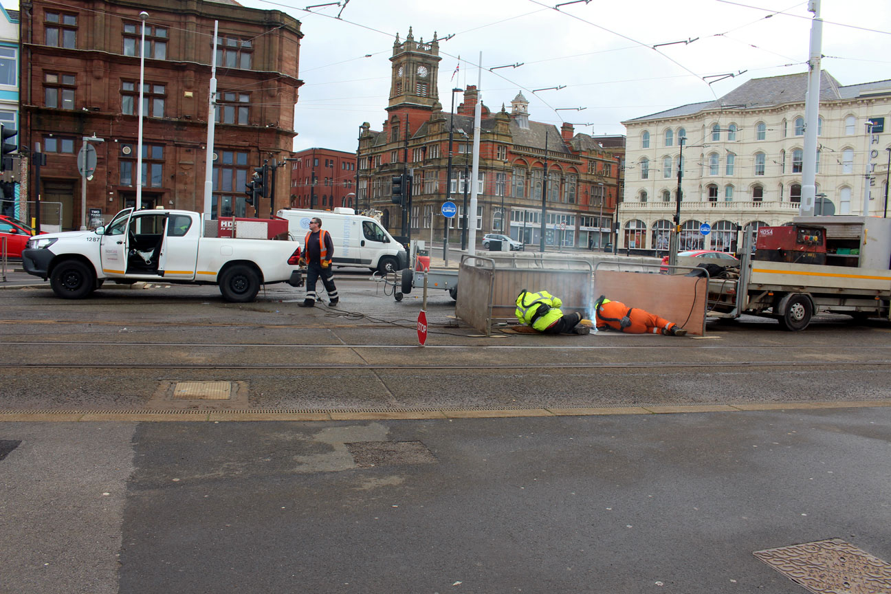 With barriers surrounding the worksite the work crew are involved in welding of the points.