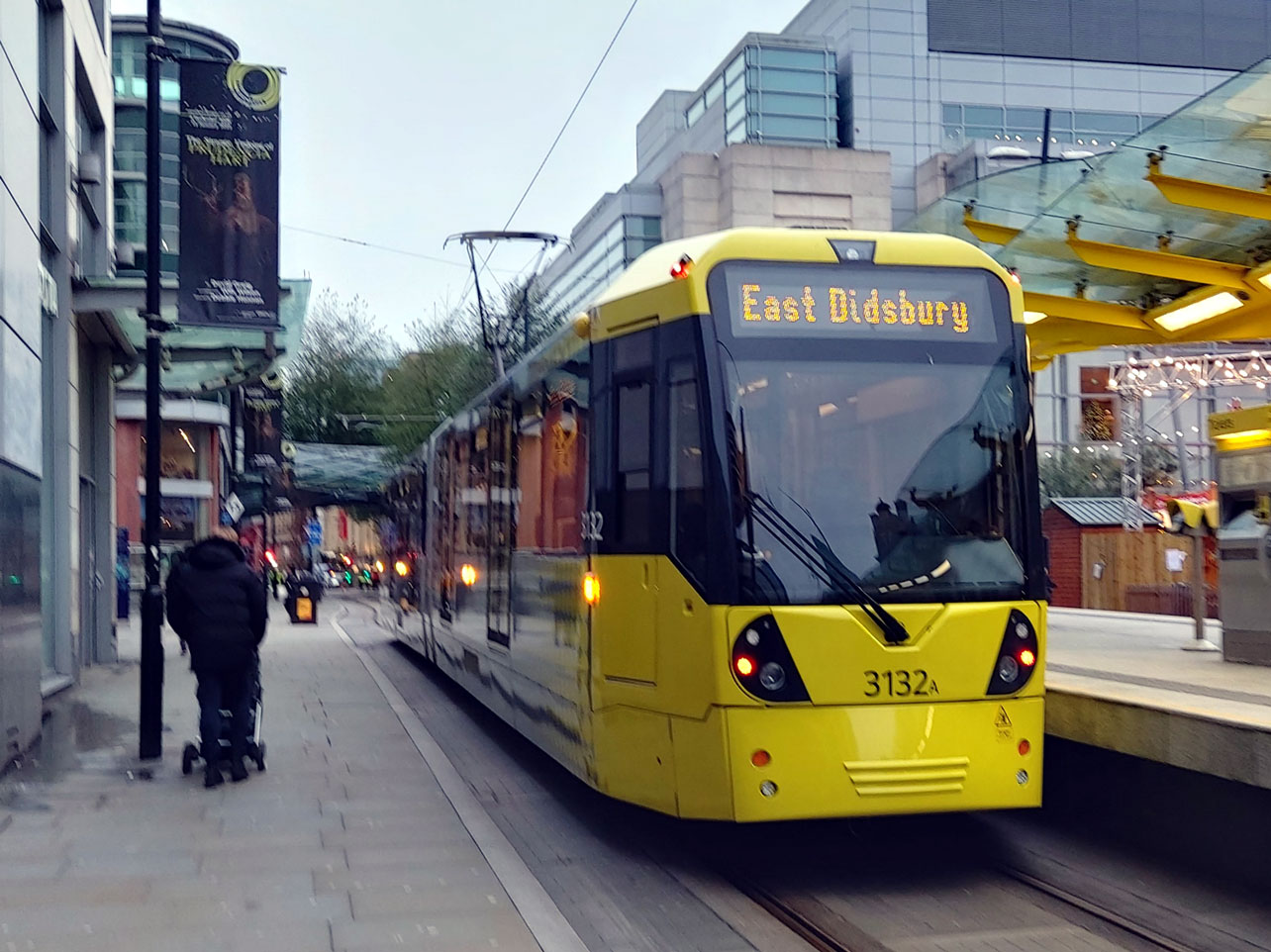 Exchange Square stop opened on 6th December 2015 at which point in time it was a terminus for trams from Rochdale ahead of the full opening of 2CC in 2017. One of the newest trams to operate on the system, 3132, is captured at the stop with a service for East Didsbury. (Photograph by Tim Blazey, 7th December 2021)