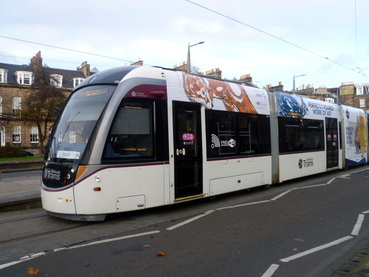 273 received this design for Heverlee Lager in October 2018 and at the time of writing is still carried on the tram. With its white back background the advert merges into the fleet livery well and as with all ads in Edinburgh it features two full height adverts on the third and fifth sections of the tram. This first photo shows the front and centre of the tram at West End with the tram heading off to the Airport.
