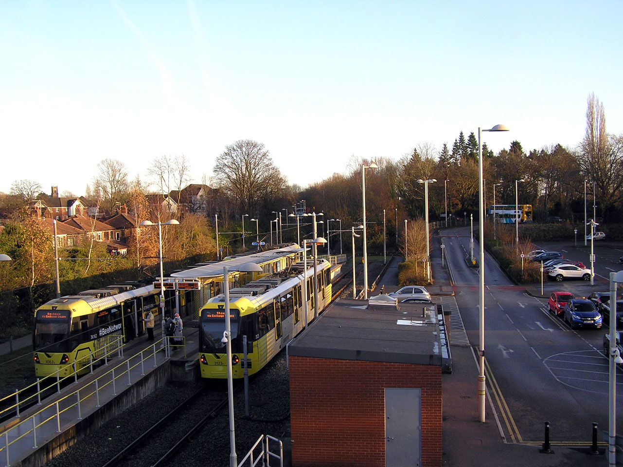 Back to East Disbury where this view from above shows both platforms occupied. 3062 is at the front of a double unit on the far side (complete with Bee Network vinyls) as 3123 stands in the closer platform. In the distance on the right the scene is completed by a Stagecoach bus.
