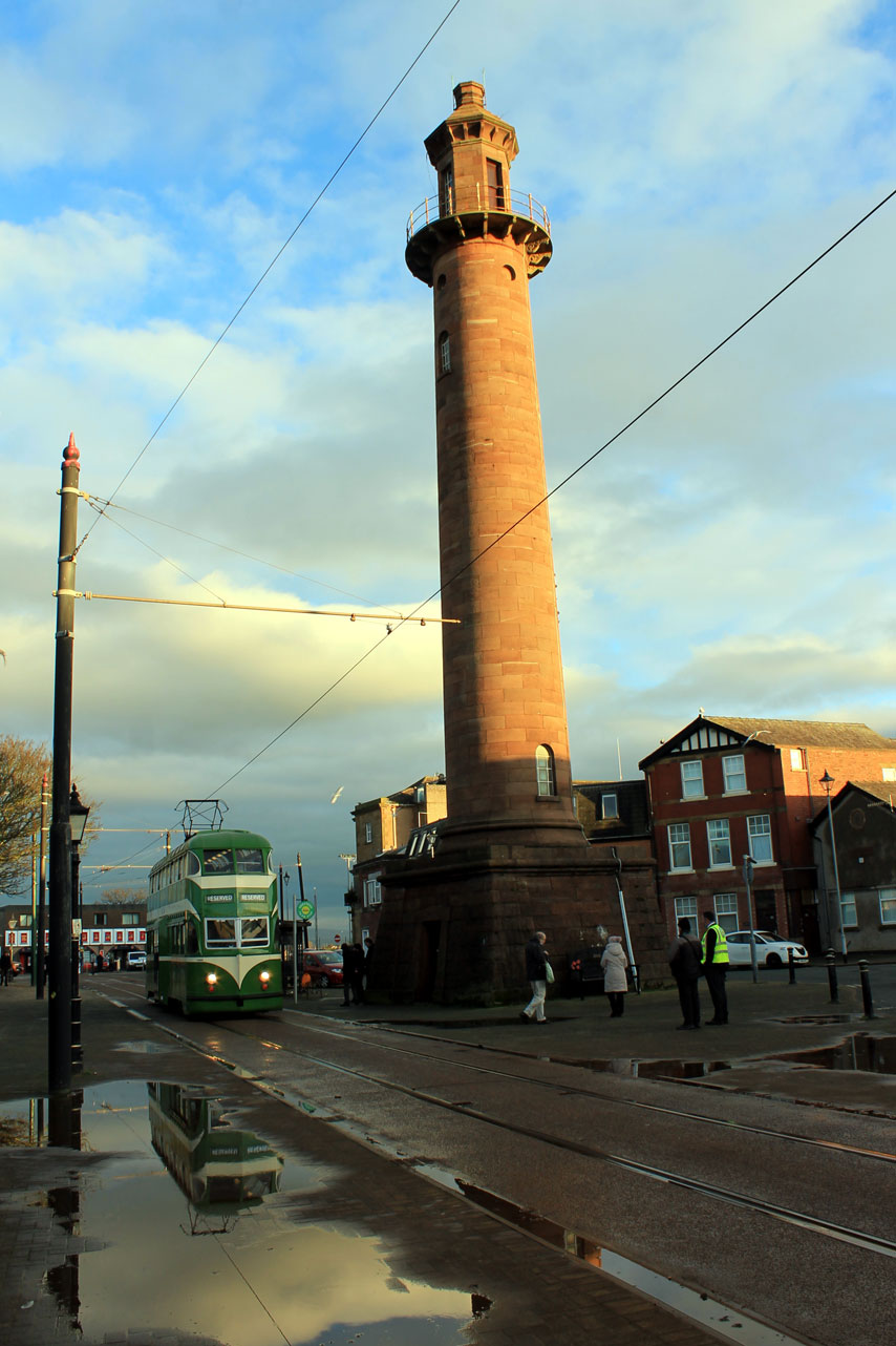 700, Pharos Lighthouse, puddles reflecting the tram at Pharos Street again.