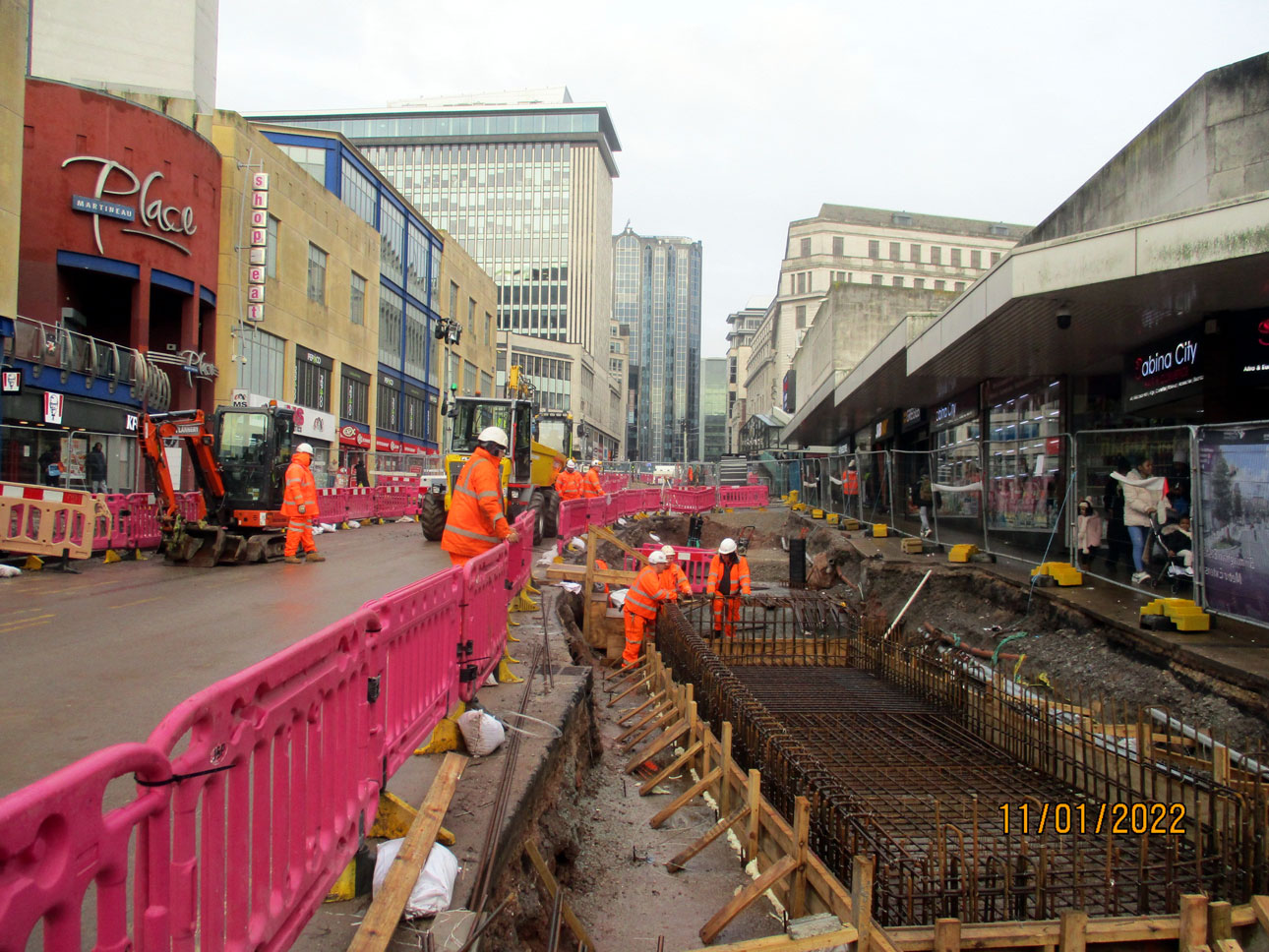 Close to the Bull Street/Corporation Street junction and the original road surface has been removed to allow strengthening work to take place before track laying can commence.