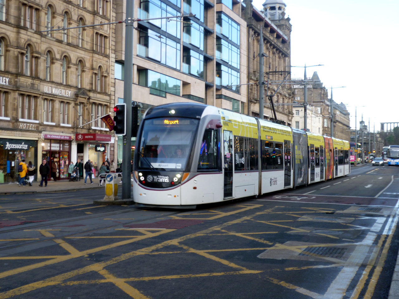 Carrying adverts for the Edinburgh International Festival this is 277 heading westbound to the Airport along Princes Street just after joining the busy road after curving round from the St Andrew Square stop. The one time temperance Old Waverley Hotel is on the left at the South Saint David Street intersection. (Photograph by Roy Calderwood, 9th December 2021)