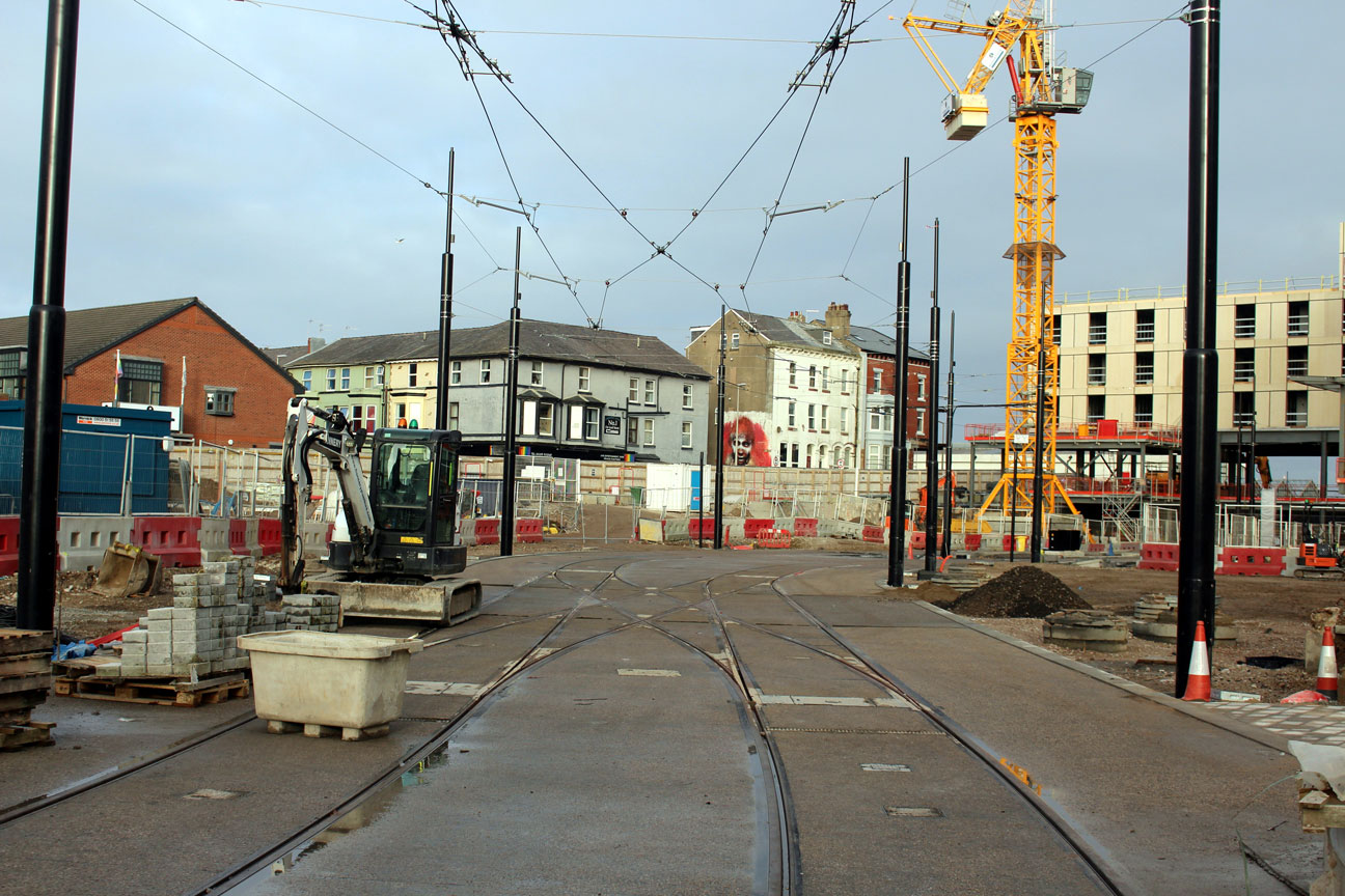 Looking along the line as you go through the “front door” of Wilko’s. Track in place, concrete surface completed, overhead poles erected and wire installed.