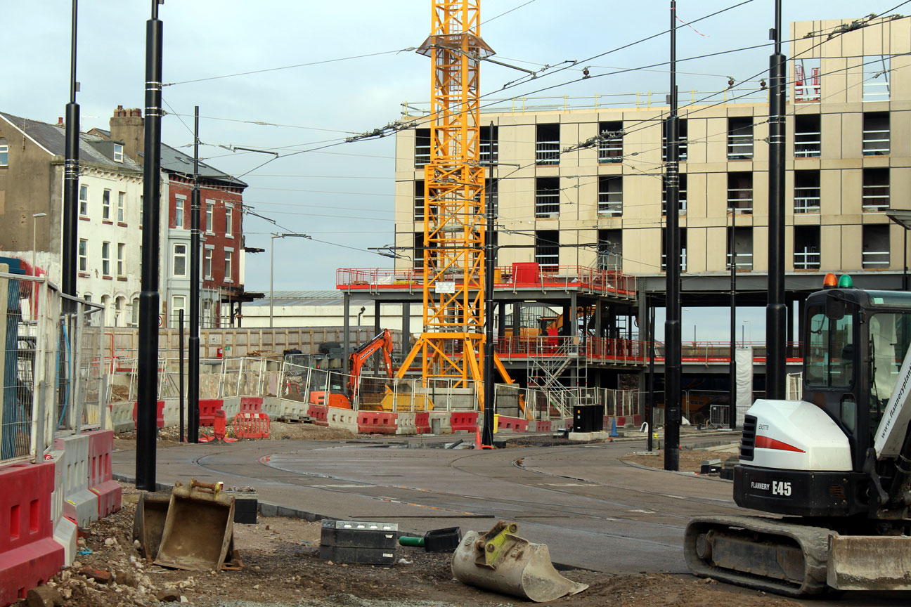Here we look as the tracks curve round on the approach to the tramstop. Top right you can see the latest level of the hotel being built.