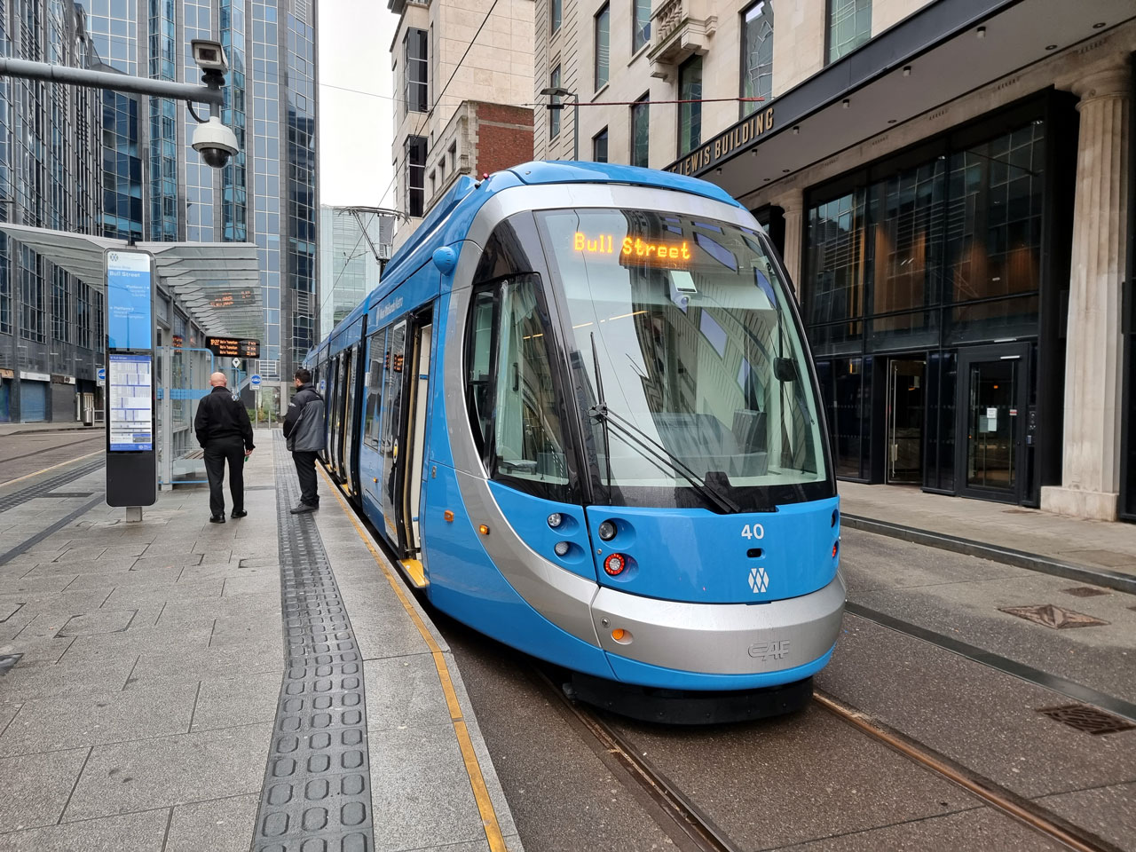 The driver and conductor of 40 wait on the platform at Bull Street as the tram waits out time before heading back to Wolverhampton St George’s. (Both Photographs by Michael Morton, 18th December 2021)