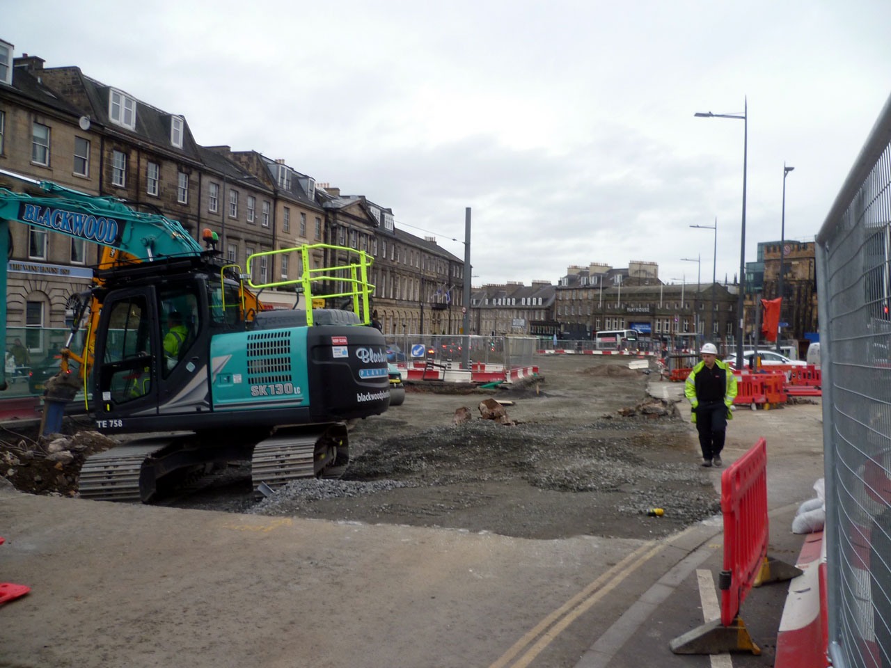 And the reason for all those delays and disruption is seen in this photo which is looking eastbound across the Picardy Place tramstop site. The pole in the centre holds up the end of the current overhead and trams to Leith will run away from the camera. The excavator on the left is in the middle of the York Place/Broughton Street junction. The Playhouse Theatre can be seen in the distance with the four flagpoles and roughly along the line of lampposts on the right there was, until the 1960s, a block of tenements where Arthur Conan Doyle (creator of Sherlock Holmes) was born in 1859. (Photograph by Roy Calderwood, 28th January 2022)