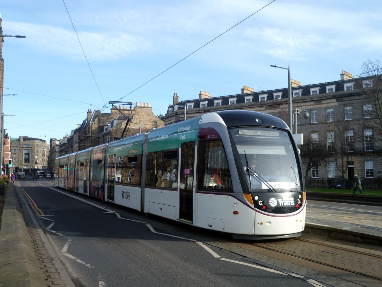 254 stands at the platform having arrived from the Airport. This view is looking east towards Princes Street with the Johnnie Walker building seen closing the view in the distance and Atholl Crescent on the right.