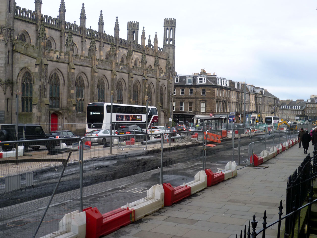 Looking in the opposite direction towards St Paul’s and St George’s Church and the Broughton Street junction. The road surface in the foreground has been removed and the bus in the distance is roughly where the Picardy Place stop will be situated.