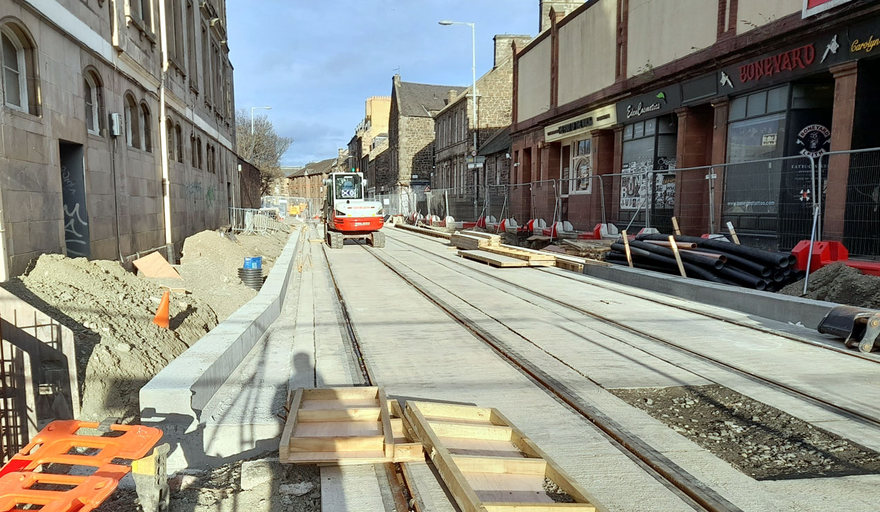 The Foot of Leith Walk tramstop is being constructed and will have the platforms as part of the footpath. The upstands at the platform edge are being cast in situ. (All Photographs by John Hampton, 12th February 2022)
