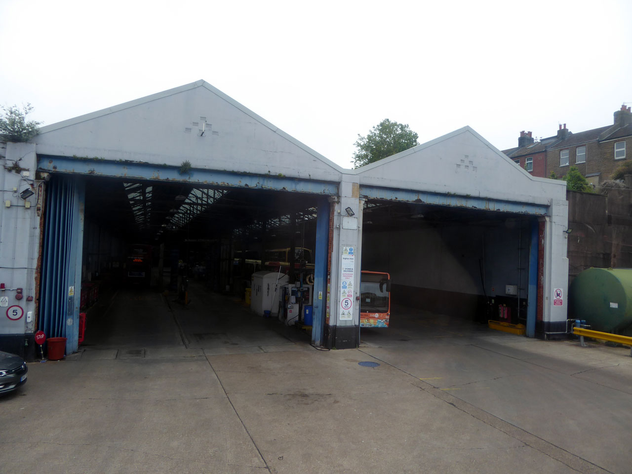 Taken from the top deck of a bus, this view shows the inside of the all old tram shed – and current bus depot during a special tour of old Brighton trolleybus routes. (Photograph by Tony Sullivan, 4th July 2021)