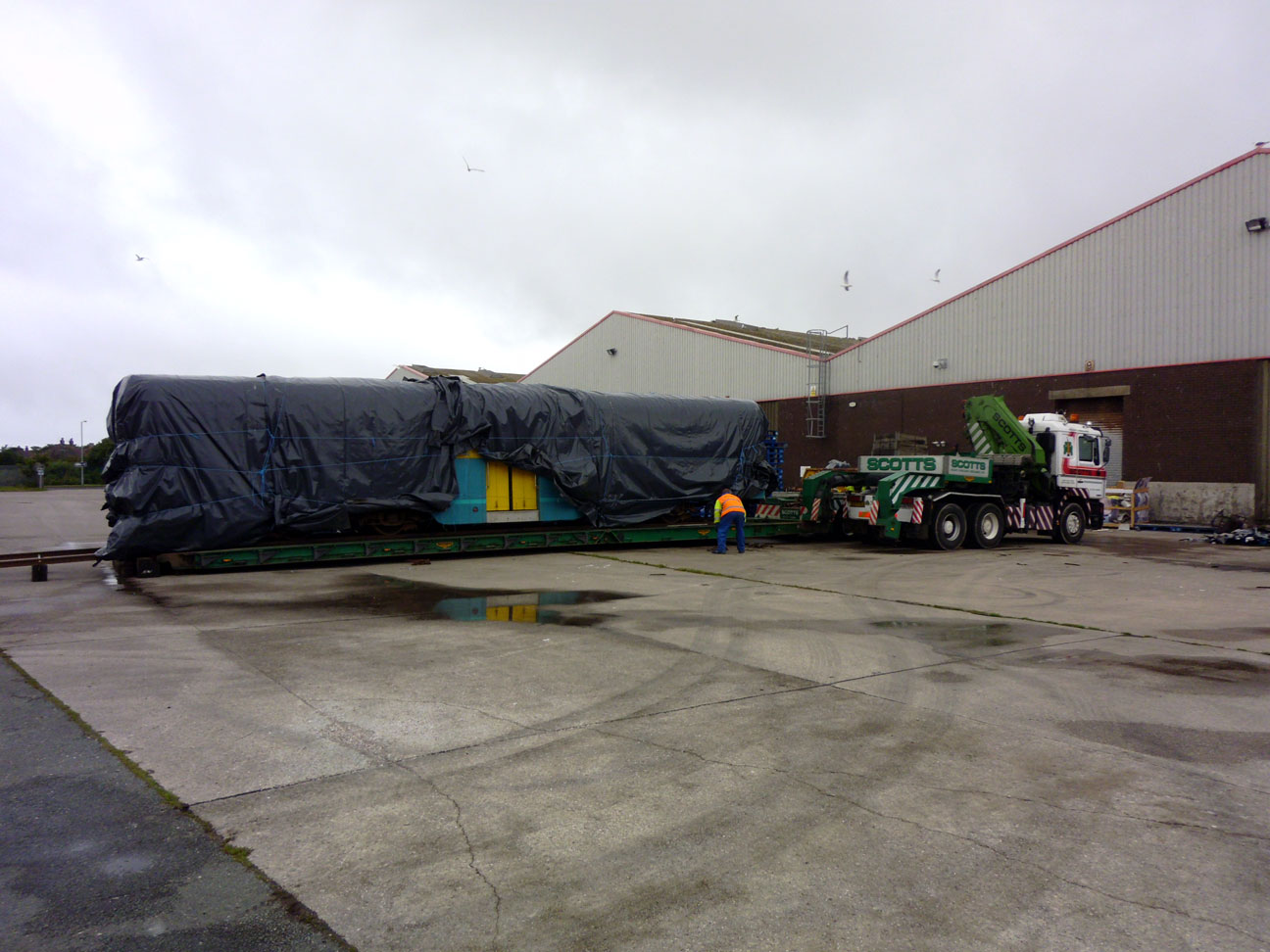 Twin Trailer Car 683 – retaining the covers fitted to protect it from the elements – sits on the back of the familar sight of a Scotts low loader.