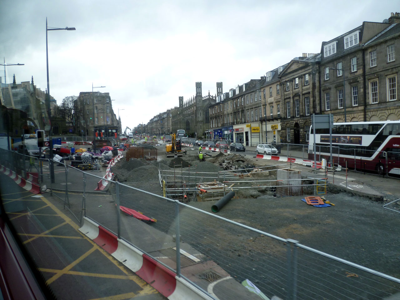 Five days after the previous photo and this is the site of Picardy Place stop taken from a passing bus. This looks due west and although the rails have now crossed over the York Place/Broughton Street intersection (just this side of the church), the ground is still being prepared at the tramstop with various holes in the ground. The Conan Doyle pub is the black painted corner building (centre left) – the former York Place stop was just beyond that. (Both Photographs by Roy Calderwood)