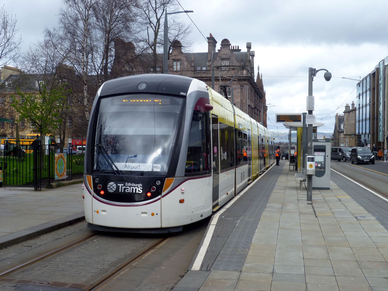 262 has just arrived and terminated at St Andrew Square. It will soon move forward and turn the corner to use the crossover in York Place. The buses in the left background are the open toppers of Edinburgh Bus Tours and Bright Bus Tours who use the north side of St Andrew Square as their terminus. Their previous terminus was at Waverley Bridge but the Council largely pedestrianised Waverley Bridge in June 2020. Trams once went round all four side of the Square.