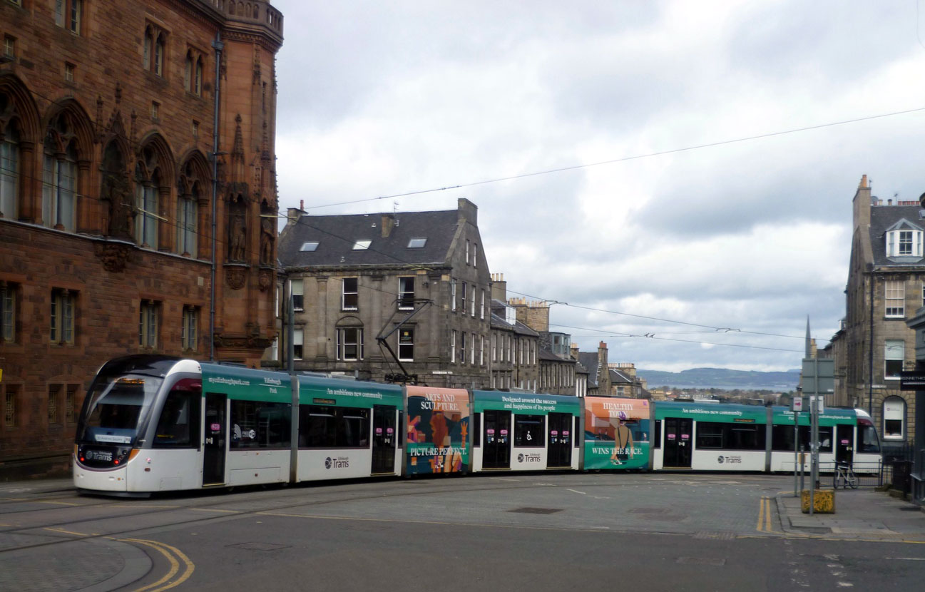 271 has left the stop and now rounds the curve to York Place. Red sandstone Scottish National Portrait Gallery on the left. Dublin Street goes down hill beyond tram. The hills of Fife across the Firth of Forth in the distance.