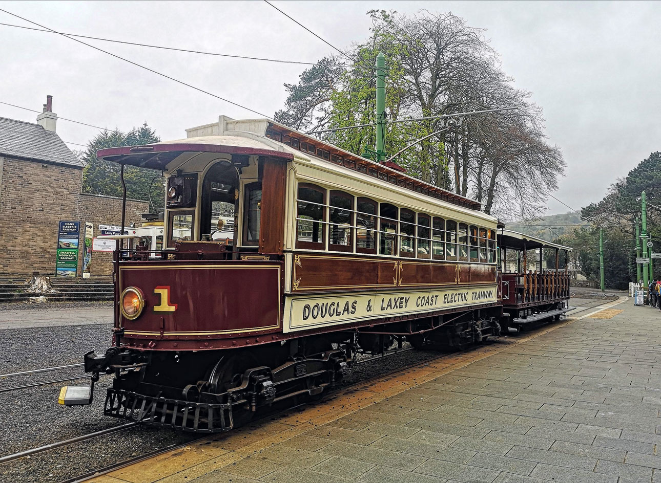 1+51 sit in Laxey Station. 1 has just returned to service in this Douglas & Laxey Coast Electric Tramway livery after being repainted over the winter.