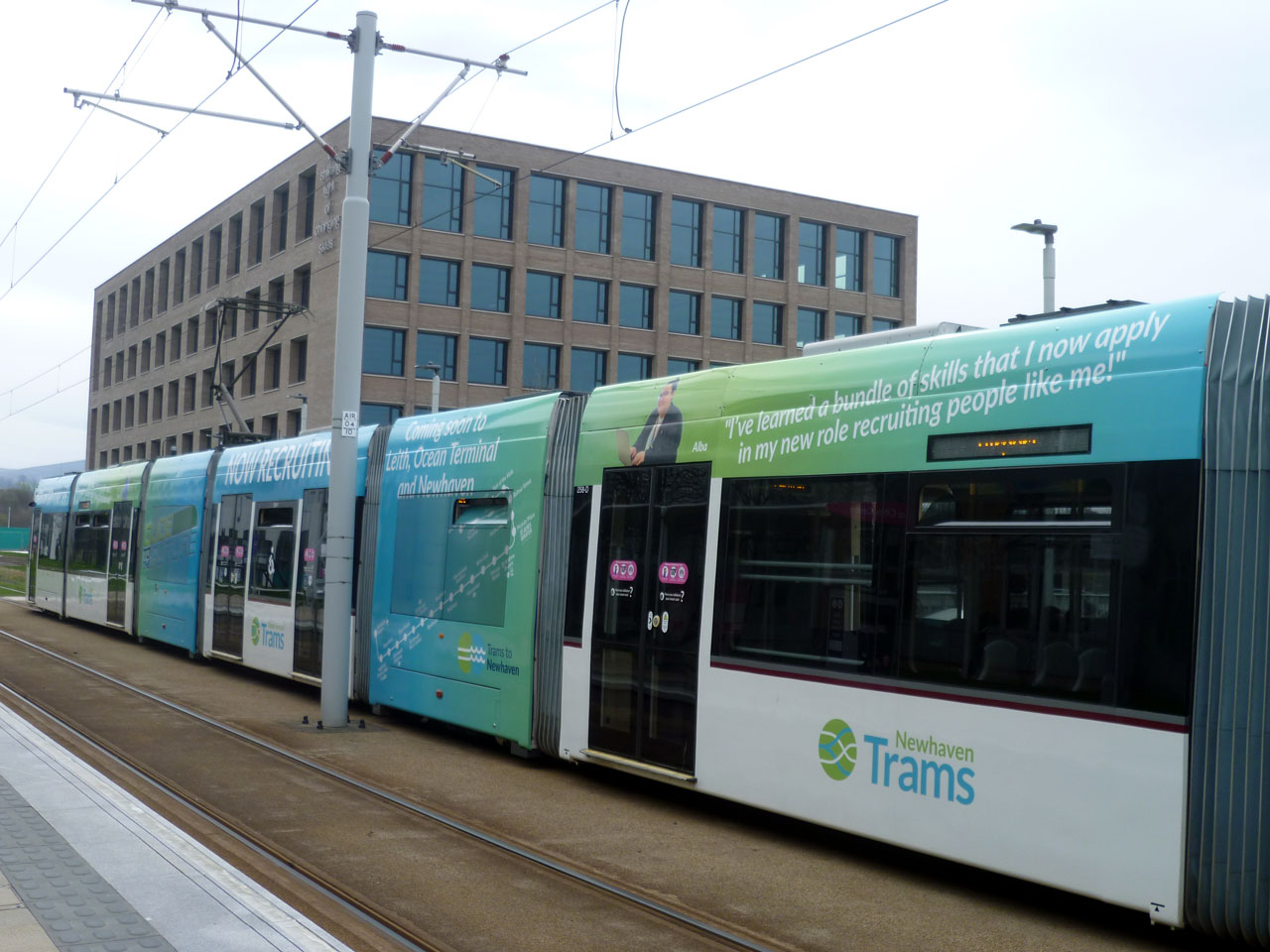 Earlier in the day and we take a closer look at some of the detail of the new wrap which as well as highlighting the recruitment campaign also highlights the extended route to Newhaven. Behind the tram is the first building completed as part of Parabola’s development of the second stage of Edinburgh Park – these are new offices called 1 New Park Square and lies on the west side of the tramway at the Edinburgh Park Central stop. (Both Photographs by Roy Calderwood, 11th April 2022)