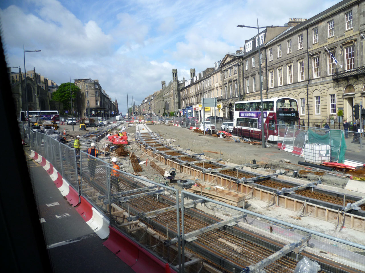 This view is looking due west – in tramway terms towards the next stop at St Andrew Square – with the Airport bound track on the left and the Newhaven bound track on the right. On the extreme left we can just make out St Mary’s Catholic Cathedral with Holiday Inn Express on the other side. To the right of the tree is a blank painted corner pub – the Conan Doyle. Named after the famous author of the Sherlock Holmes stories, Arthur Conan Doyle was born in a new demolished tenement beyond the three workmen. There used to be a statue of Sherlock Holmes here and it will return once the final layout in this location is confirmed. (Photograph by Roy Calderwood, 21st May 2022)