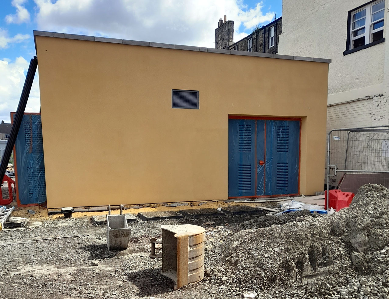 Further along the extension and one of two new substations being built for the extension is now structurally complete. Built on part of the site of the former first generation tram depot on Leith Walk work is still needing on fitting it out with the electrical equipment with new cables currently being laid to link with the track. (Photograph by John Hampton, 27th May 2022)