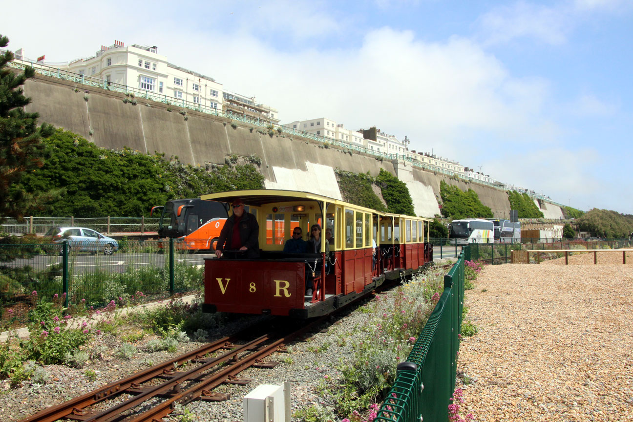 8+7 round the bend towards the car sheds. This is the area where the line when originally built was on an iron viaduct as it crossed way above the then beach level. Over the years the pebbles have been driven by the sea under the viaduct – but if you know what you are looking for it is still possible to see some of the iron work.